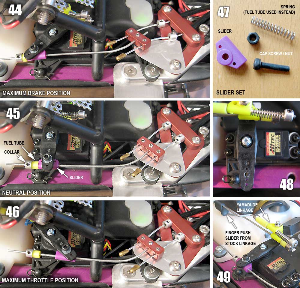 below; As such, another option would be to retain the original position of collars (as Option A) AND use another collar as shown above (pics 41 -43). This would then maintain a fixed cable position at the calipers at full throttle, but allow the servo link wire to slide through the clamp. (credit: Allanach Racing) Other solutions to reduce